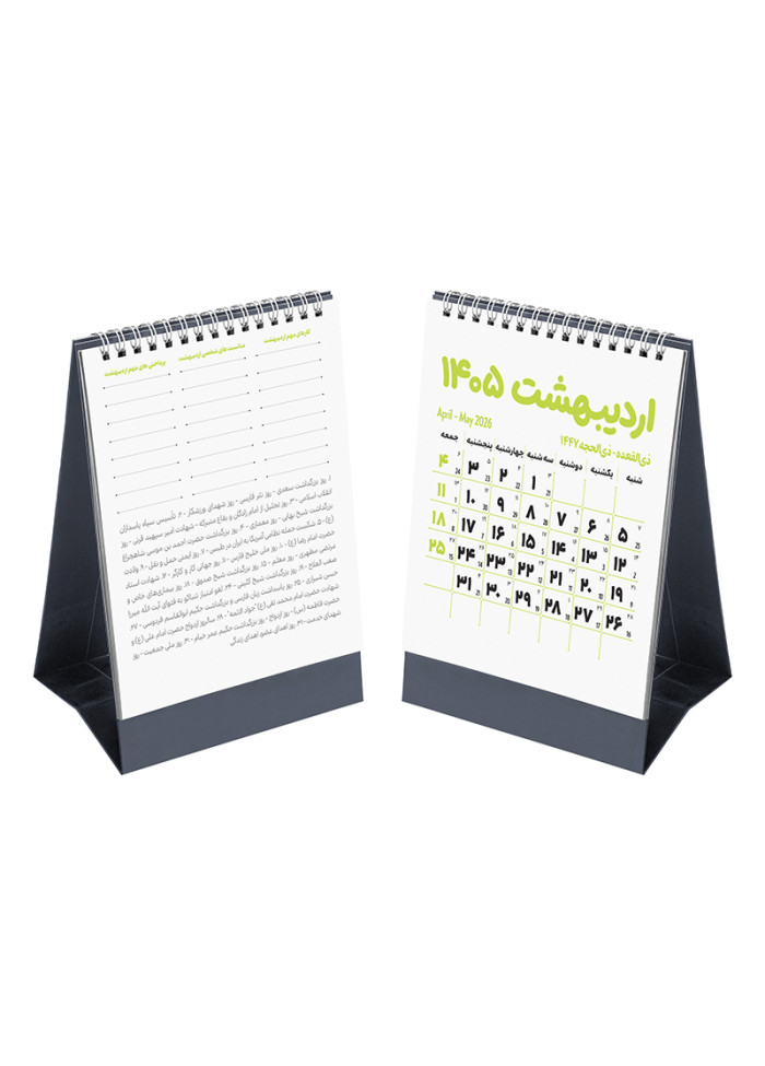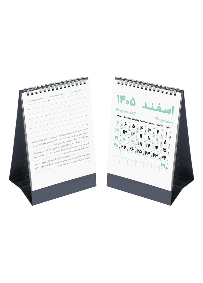 • طرح صفحه نخست ویژه: هر ماه یک صفحه‌ی مجزا داره و پشت هر صفحه، کارهای مهم، مناسبت‌های شخصی و پرداختی‌های مهم اون ماه مشخص شده تا هیچ کاری یادت نره.