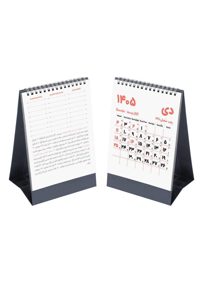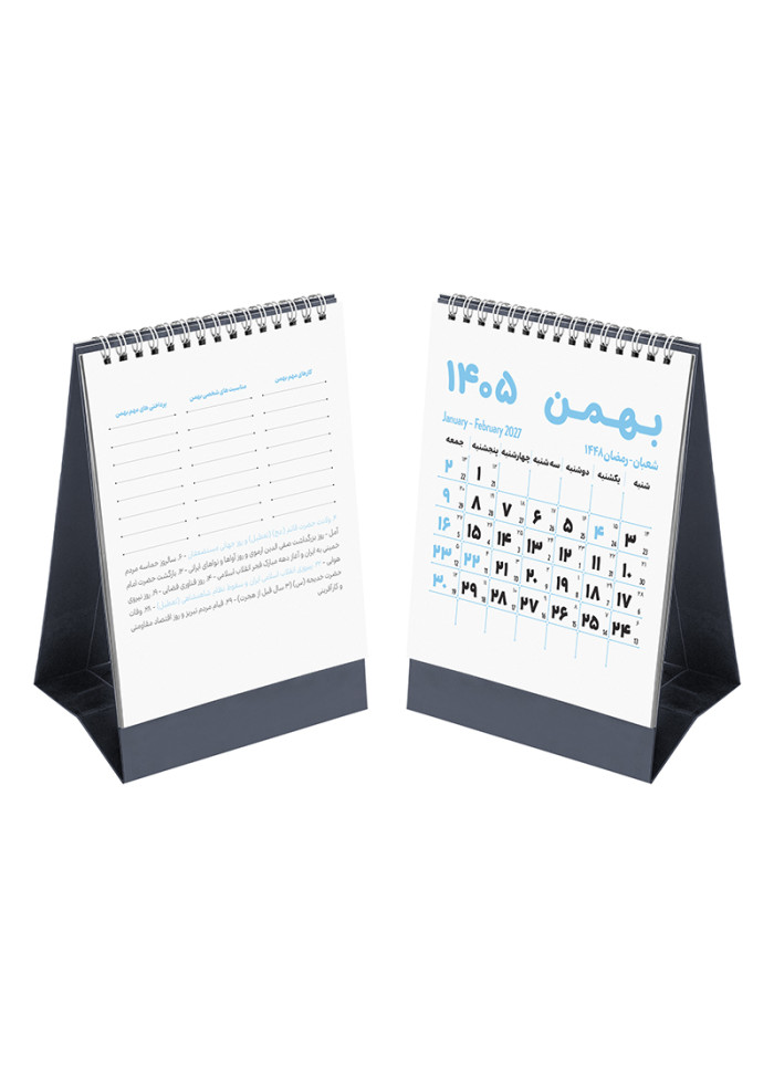• طرح صفحه نخست ویژه: هر ماه یک صفحه‌ی مجزا داره و پشت هر صفحه، کارهای مهم، مناسبت‌های شخصی و پرداختی‌های مهم اون ماه مشخص شده تا هیچ کاری یادت نره.