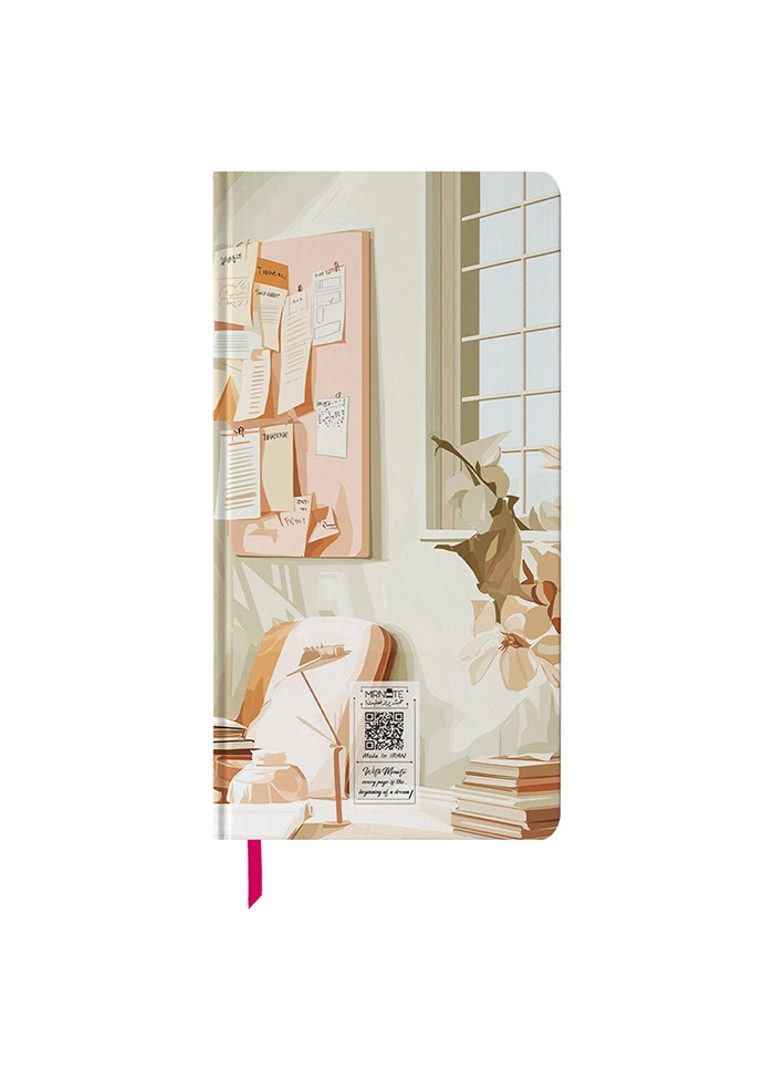 با ابعاد ۱۰×۱۸ سانتی‌متر، این دفتر اندازه‌ای خوش‌دست دارد؛ نه آن‌قدر کوچک که محدودت کند، نه آن‌قدر بزرگ که حملش سخت شود. جلد سخت با روکش سلفونی براق و مقاوم از صفحات داخلی محافظت می‌کند و حس حرفه‌ای و باکیفیتی به دفتر می‌بخشد.